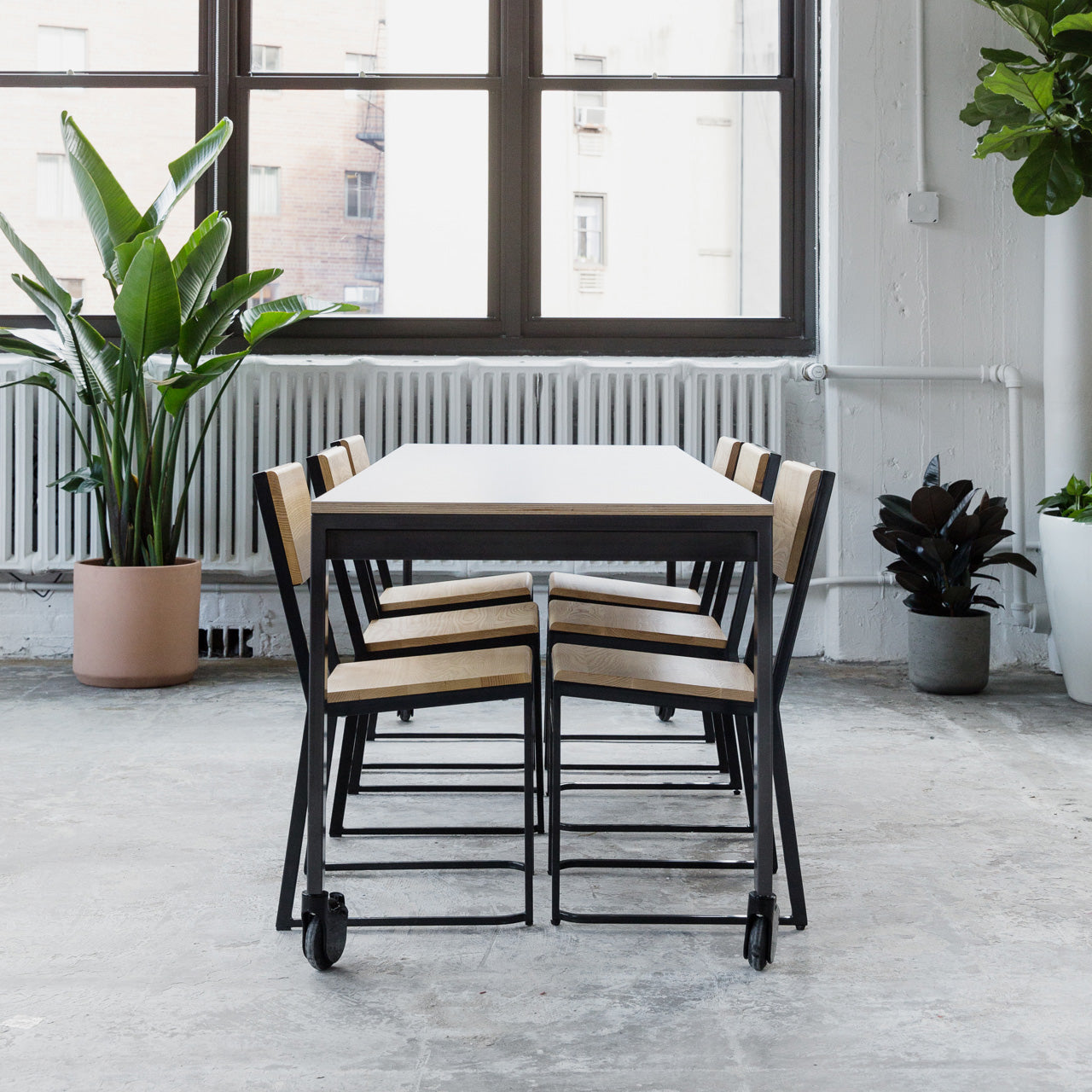 With its variety of size options and accessories (power + casters), this system is suited for diverse range of uses, whether you need a breakout table, mobile training table, or hot-desk solution. The Band Table's minimal yet sturdy design incorporates a powder-coated steel base and a selection of top surface materials, including real wood veneers and solid wood in all of Uhuru’s standard finish choices, ensuring a durable option for any aesthetic.