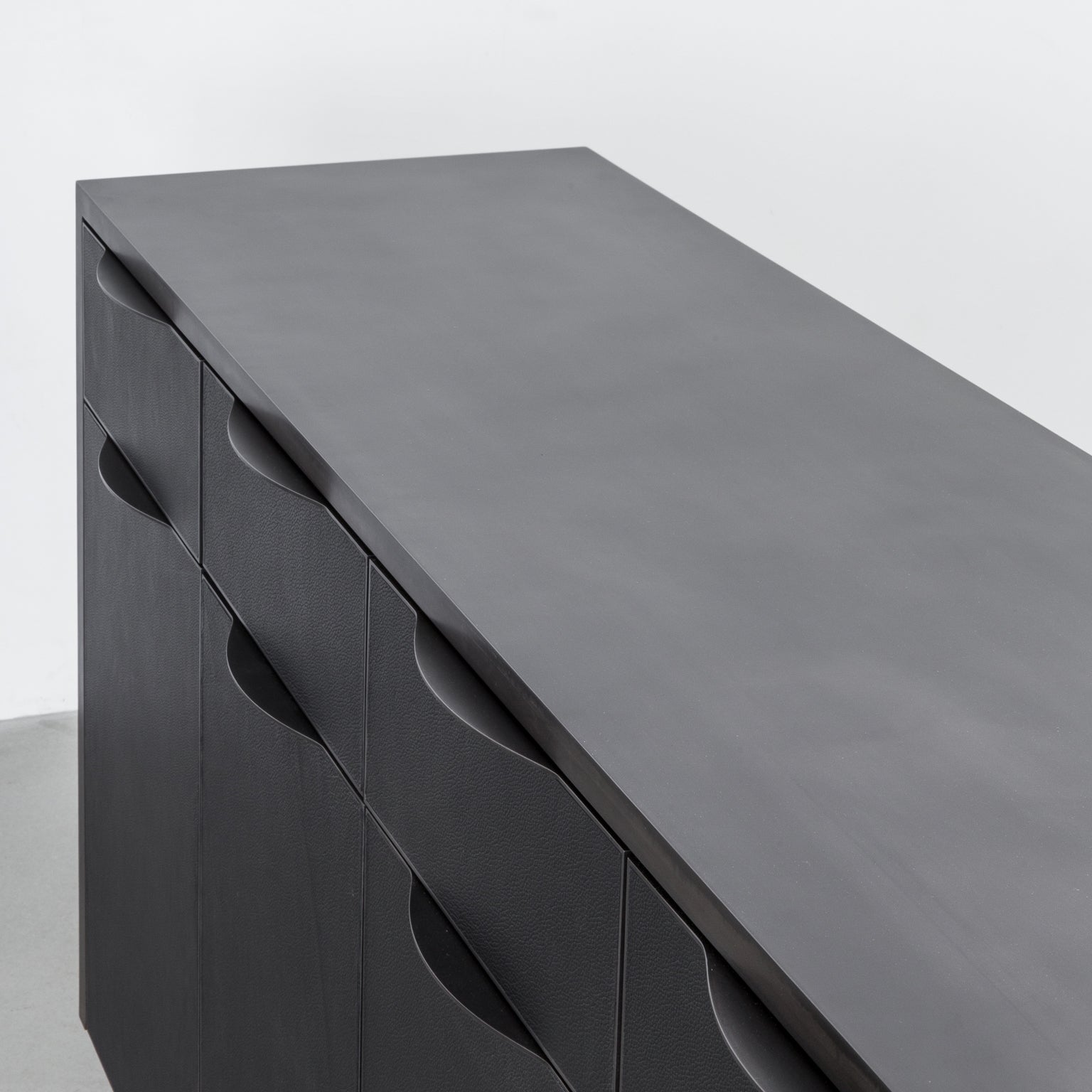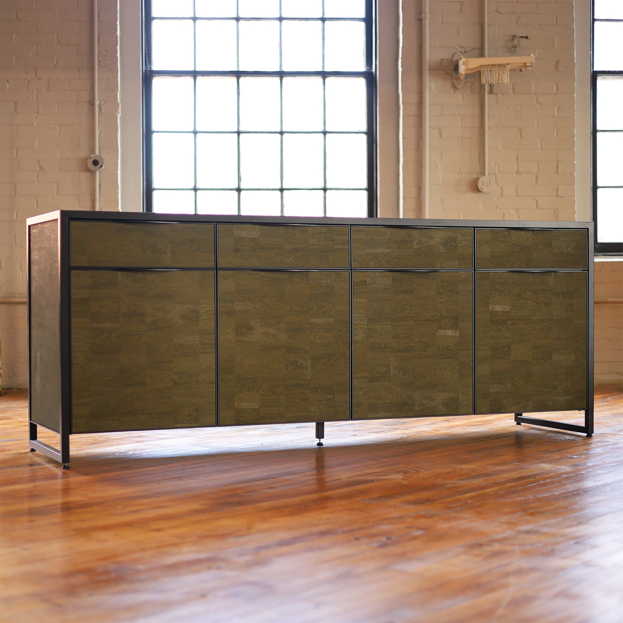 Each Cairns Credenza features a powder coated steel frame with seamlessly integrated drawer and door pulls to hold a leather or fabric clad top surface, drawer fronts and door fronts. Steel legs elevate the unit off the ground.